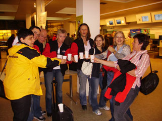 Gute Laune schon vor dem Abflug vom Flughafen in Salzburg. Silvias bereits zur Tradition gewordene Flasche Prosecco trug das seine dazu bei. |
